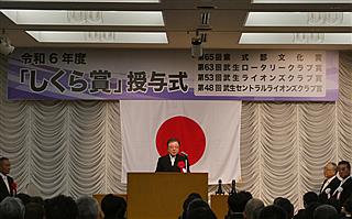 11月12日(土)に福井県武生高等学校の葵講堂にてしくら賞の授与式が行われました。しくら賞とは、越前市内にある5団体(紫式部顕彰会・武生RC・武生セントラルLC・武生府中RC・武生LC)が、各部門別に分かれて、それに秀でた優秀な児童生徒を表彰する賞です。当クラブは、武生ライオンズクラブ賞としてスポーツ部門を担当。児童生徒25名と団体賞として南越中学校駅伝チームを表彰しました。また、当クラブが今年度の運営を担当しました。
