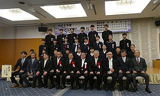 しくら賞とは、越前市内の5団体が部門ごとに分かれ、市内小中学校の最高学年の優秀な児童生徒を表彰するものです。当クラブは、スポーツ部門を担当。22名の児童生徒と団体賞として、武生第二中学校男子ソフトテニス部と南越中学校男子バレーボール部に武生ライオンズクラブ賞を授与致しました。