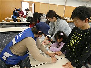開会式のあと、参加者を4つのグループに分けて 4つーのブース(①AED体験 ②担架づくり体験 ③防災グッズ作り体験 ④起震車体験)を順番にまわり、各ブースの指導者のもと経験しました。