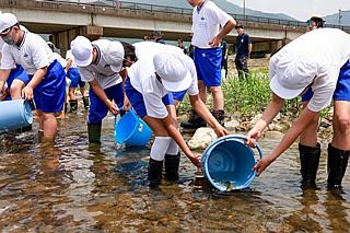 越前市を流れる自然豊かな日野川上流域に生息する山女魚(やまめ)、一部が海へ降りサクラマスとして遡上します。その遡上する日野川流域に住む武生西小学校6年生児童55名に放流体験をしてもらい、自然、ふるさと、環境についての好奇心を育んでもらおうと実施しました。